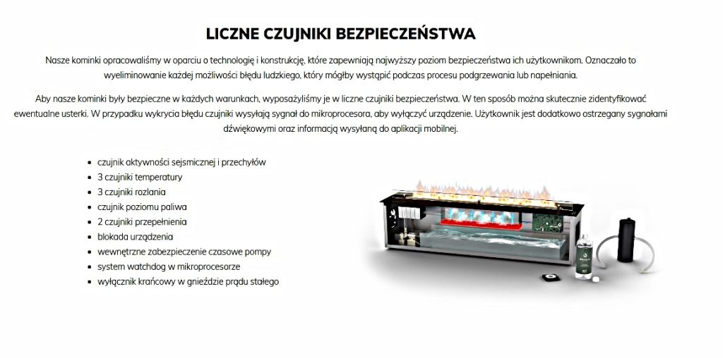 Osiągnij bezpieczny ogień w swojej przestrzeni dzięki zastosowaniu innowacyjnych technologii w oferowanych przez nas paleniskach Planika. W automatycznych kominkach etanolowych użyta została opatentowana technologia BEV, gwarantująca czyste spalanie paliwa i brak jego kontaktu bezpośrednio z płomieniem. Pracą kominków Planika zarządza zaawansowany mikroprocesor, a w trosce o bezpieczeństwo urządzenia wyposażone są w liczne czujniki. Jest to najbezpieczniejsze rozwiązanie na rynku produktów na biopaliwo. Dla wygody korzystania paliwo uzupełniane jest systemem automatycznej pompki, a kominkiem sterować można z poziomu panelu na palenisku oraz pilotem.