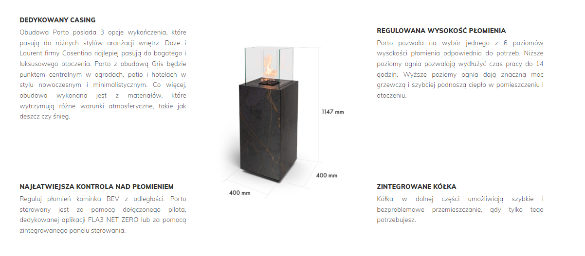 Porto Core Planika to palenisko do indywidualnego wykończenia z serii automatycznych kominków zewnętrznych od Planika.  Kominek opiera się o dobrze znaną, innowacyjną technologię czystego spalanie oparów biopaliwa BEV opatentowaną przez Planika. W serii palenisk Porto znajdziemy najbardziej zaawansowane rozwiązania i czujniki bezpieczeństwa, jak i możliwość sterowania z poziomu aplikacji.